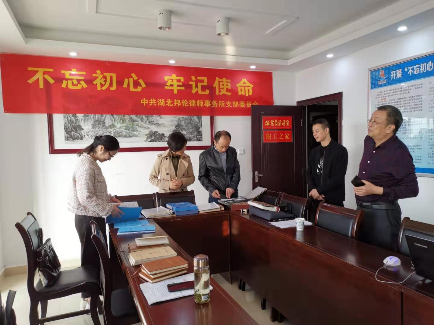首先,指导组一行来到湖北邦伦律师事务所,查看了邦伦所历年来党建工作资料,针对“不忘初心、牢记使命”主题教育活动的职责任务,对邦伦所党支部的学习情况、“六个一”落实情况、“律师向社区报到”等相关工作进行检查,在听取了该所书记的工作汇报,汪会长给予了充分肯定,认为该所“不忘初心、牢记使命”主题教育开展扎实,富有成效,且党建活动全程留痕的做法值得推广。